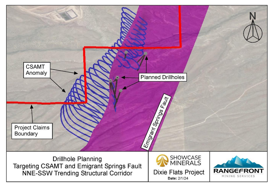 CALGARY, AB / February 12, 2024 / Showcase Minerals Inc. (CSE: SHOW) (“Showcase“) is pleased to announce it has designed a 12-hole angled drill program from five drill pads totaling 12,000 feet of drilling at its Dixie Flats-North Star Property located in Nevada. The angled holes are designed to penetrate the Chainman Shale, Webb Mudstone and Devils Gate limestone near mineralized structures. The interfaces of these three units along geologic structures hosts the primary mineralization at the property, and interpretation of the new CSAMT data has provided exciting drill targets to refine the location of these structures. This new drilling should significantly increase the confidence in the location of the structures locally and will be highly valuable in improving the structural and lithologic models of the property.
